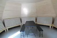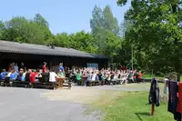 10 Wigwamhütten mit je 7 Schlafstellen, 1 Blockhütte mit zwei getrennten Waschräumen für Damen und Herren mit je 6 Waschplätzen, 2 Duschen, Toiletten für Damen und Herren, 1 Essraum für min. 70 Personen, Küche (Porzellan und Besteck für 70 Personen), Grillplatz. Wigwams liegen direkt an einem Bach, in dem gespielt und gestaut werden kann.Freizeit