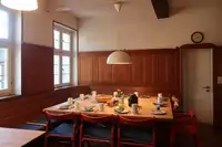 Als AUFENTHALTSRAUM wird gern die gemütliche Küche genutzt. Die Diele im ersten Stock mit dem historischen Kaminofen dient ebenfalls als Aufenthaltsraum. Das "Musikzimmer" mit Klavier, Gitarre und Steeldrum hat zwei ausziehbare Schlafsofas. Es kann wahlweise als Schlafraum oder als kleiner Gruppenraum genutzt werden.