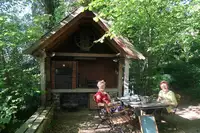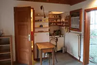 Am Teich ist ein kleines Apartment im ehemaligen Waschhaus mit Bad und Kochecke. Außer dem ausziehbaren Schlafsofa gibt es noch eine Empore zum Schlafen,
