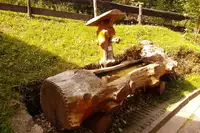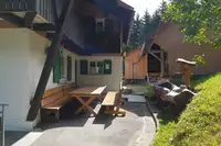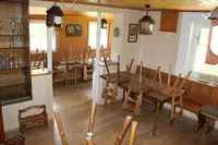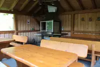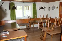 Trockenraum, Zimmer mit fließend Wasser kalt/warm Zentralheizung, Küche zur freien Benutzung mit 2 Elektroherden, 2 Kühlschränken und großem Holzofen - mit ihm kann auch der angrenzende Aufenthaltsraum geheizt werden. 12 Autoparkplätze, Spielwiese, Grillhütte mit Sitzgarnituren, überdachter Freisitz.