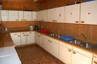 Küche: Direkt an den Saal grenzt die Küche an, welche mit einem fünf-flammigen Gasherd, einem Kühlschrank mit Gefrierfach, zwei Spülbecken, einer Kaffeemaschine, einem Wasserkocher sowie Geschirr, Besteck und Arbeitsflächen ausgestattet ist.