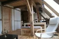 Das Vogelnest im ersten Stock kann sechs Personen beherbergen, Wohnküche, großes Bad und bietet mit seinen hohen Decken und einer Empore besonderen Charme.