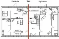 Das große, attraktive Haus hat drei Wohnungen mit je einem Bad und Küche. Zwei Wohnungen (die Gaststube und das Jagdzimmer) sind im Erdgeschoss und im ersten Stock befindet sich die dritte Wohnung sowie zwei weitere Schlafräume.Die Gaststube (EG) bietet Platz für 6 Personen mit zwei Schlafzimmern (ein Doppelzimmer, einem Zimmer mit einem Etagenbett und einem Doppelbett), einem großen Wohn- und Essraum, mit gemütlichem Kaminofen, Badezimmer, großer Küche (mit Spülmaschine und Waschmaschine), Terrasse. Der alte schwedische Tisch bietet Platz für große Gruppen und kann ergänzt werden durch vorhandenen Küchentisch oder Bierzeltgarnitur.