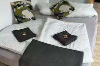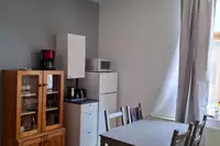 Haus mit sechs 2-Zimmer-Wohnungen inkl. vollausgestattete Küchen und eigene Bäder, ein Gemeinschaftsraum mit eigener Küche und Sofalandschaft. In jeder Wohnung Küche, Geschirr, Kaffeemaschine, Wasserkocher, Mikrowelle, Kühlschrank, große Doppelbett in Schlafzimmer und Schlafsofa in Wohnzimmer. In zwei Wohnungen getrennte Küchen, in 4 Wohnungen und Gemeinschaftsbereich sind die Küchen in Wohnzimmern integriert.