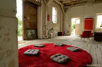 Der ehemalige Güterschuppen ist ein hoher Raum mit Holzbalkendecke in noch rohem Charme (siehe Bilder). Wer damit fein ist, kann ihn schon jetzt nutzen für Seminare, Kurse, Workshops, Gruppentreffen, Fotoshootings/Videodrehs oder kleine Kulturveranstaltungen.Er ist ausgestattet mit gemütlichen Sitzmöbeln in einem Bereich und verfügt über genug Platz für weitere Bestuhlung und Stellwände. Das seitliche Schiebetor kann geöffnet werden und ermöglicht einen weiten Blick ins Unstruttal. Der Raum misst ca. 50 m² und ist über eine Treppe erreichbar.