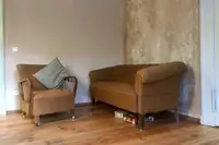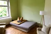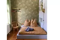 Im Obergeschoss befinden sich stilvoll eingerichtete Ferienzimmer. Das Einzelzimmer, Doppelzimmer und die Suite mit jeweils eigenem Bad bieten insgesamt sieben Personen einen Schlafplatz. Eine Aufbettung für eine achte Person ist möglich. Sollten mehr Schlafplätze benötigt werden, bestehen im Ort weitere Möglichkeiten, die ich gern für Sie anfragen kann.