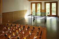 Kicker, Tischtennisplatte, Fernseher, DVD-Player, Musikanlage, Flipchart