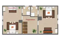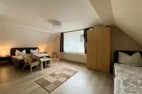 Das Gruppenhaus war zuvor ein Landhotel mit Restaurant und 9 Hotelzimmer, jeweils mit Bad und TV. Wir haben die ehemalige Eigentümerwohnung zu weiteren Schlafzimmern umgestaltet, so dass das Haus nun über 13 Schlafzimmer verfügt. Bis auf größere Familienzimmer (4 Personen) im Dachgeschoss gibt es nur 2Doppelzimmer (im EG 2 Doppelzimmer mit Durchgang, auch als Familienzimmer nutzbar).