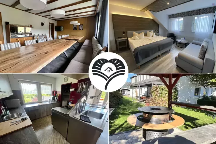 Großzügige Aufenthaltsräume – ein Esszimmer, ein TV-Zimmer und eine gemütliche Stube – laden euch dazu ein, gesellige Abende zu genießen oder ungestört miteinander ins Gespräch zu kommen.Die große, voll ausgestattete Gastro-Küche eignet sich perfekt für gemeinsames Kochen. Nach einem entspannten Saunagang könnt ihr euch im weitläufigen Garten mit überdachter Terrasse und Grillhütte treffen. Hier gibt es Raum für Erholung, Genuss und inspirierende Gespräche.