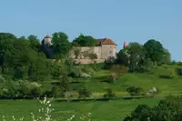 Stauferburg aus dem Jahr 1190 n.Chr. mit dickster Schildmauer Süddeutschlands, Einzellage, großer Burginnenhof mit 500-jähriger Linde, Bio Bauernhof: Rinder Streicheltiere: Hasen, Katzen, Pfauen, SchweineÜbernachtung mit Frühstück ab 4 Tagen 45,00 €, am Wochenende 50,00 €, Kinderermäßigung