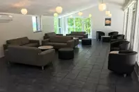Von der Terrasse kann man direkt in den großen, gemütlich eingerichteten Aufenthaltsraum mit Kaminofen gehen, von dem aus man einen wunderschönen Blick über die Landschaft und den Fjord hat. Der anliegende Speisesaal ist großzügig gestaltet und bietet Platz für 80 Personen. Er hat einen weiteren Kaminofen.