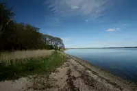 Das Grundstück vom Gruppenhaus Bjergbo/Dänemark ist 18000 m² groß und reicht bis an den Strand. Hinter dem Haus gibt es einen kleinen Hügel - von hier aus hat man eine wunderschöne Panoramaaussicht auf den Fjord. Den Strand erreicht man über einen kleinen Weg durch den umliegenden Wald am Bolzplatz vorbei.
