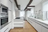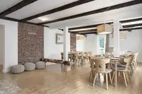 Fachwerkhaus von 1812. Sanierter Altbau mit einem Mix aus alt und modern eingerichtet auf 350 Quadratmetern. Große Küche mit moderner Kochinsel, Essraum mit offenem Kamin, als Seminarraum mit Beamer, Flipcharts, Metaplanwänden und Moderationskoffer nutzbar, großzügiger Wohnraum mit Panoramafenster in den Garten9 Schlafzimmer (vier Vier-Personen-Zimmer, fünf Doppelzimmer) sieben Bäder