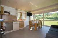 Diese Wohnung ist barrierefrei. Sie besteht aus 2 Schlafzimmern, einem Bad mit Dusche und WC, einer Wohnküche mit Panoramafenster, einem sonnigen Balkon und einer Terrasse vor dem Haus Ein Schlafzimmer ist mit einem Doppelbett, das zweite mit 2 Einzelbetten ausgestattet. Im 3. Schlafzimmer befindet sich auch ein Doppelbett. Zusätzlich gibt es die Möglichkeit in der Wohnküche eine komfortable Schlafcouch (1,84 x 1,96m) auszuziehen und Platz für eine weitere erwachsene Person zu schaffen.
