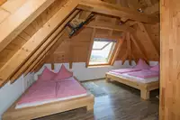 Unsere Ferienwohnung ADLERHORST liegt im 1. OG des Leibgedinghauses und ist über eine Treppe erreichbar. Die Wohnung entspricht von der Größe und Einteilung der großen Ferienwohnung im Leibgedinghaus (100 qm). Im 1. Schlafzimmer stehen ein Doppelbett und ein Einzelbett (0,90 x 2m). Das 2. Schlafzimmer besteht aus einem Doppelbett und einem Kinderbett. Im Unterschied zur 100qm - Wohnung befindet sich im 3. Zimmer ein Wohn-/ Schlafraum mit komfortabler Schlafcouch. Hier gibt es drei Schlafmöglichkeiten (jeweils 0,80 x 2 m). In Wohn-/ Schlafraum befindet sich auch ein Schwedenofen.