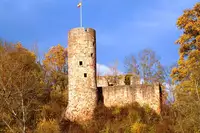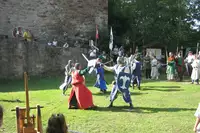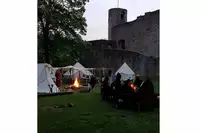 Mittelalterliche Burganlage mit Schutzhütte, Camping im historischen Burghof auf der Zeltwiese, sanitäre Anlagen direkt daneben, Natur-Schwimmbad in 200 m Entfernung, große Lagerfeuerstelle, Spielplatz, Waldnähe.Besonders geeignet für Jugendfreizeiten, Klassenfahrten, Familienfreizeiten, usw.