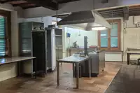 Es gibt einen großen Speisesaal direkt neben der Küche und eine ausgestattete Küche mit Gastronomieherd, Backofen, großem Kühlschrank, Kühltruhe und Schneidemaschine.