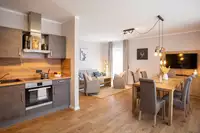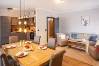 Die voll ausgestatteten Küchen ermöglichen es Dir, Mahlzeiten für die Familie zuzubereiten. Unsere großzügigen Essbereiche werden durch gemütliche Wohnbereiche ergänzt. Auf der Terrasse wartet ein 38 Grad warmer Whirlpool – perfekt für Entspannung nach einem Tag in der Natur.