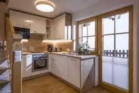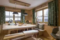 - Das Obergeschoss aus Holzblock im Alpenländischen Stil hat eine große Wohnküche mit einer großzügigen Essecke und Zugang zum Balkon mit Panorama-Terrasse. Außerdem ein Schlafzimmer ganz in Holz, ein Wohnschlafzimmer, sowie Dusche/WC. Zillerpanorama