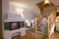- Offene Stiege ins Obergeschoss: Zwei Dreibettzimmer mit Dusche-WC und Sat-TV (davon ein Zimmer mit Balkon).