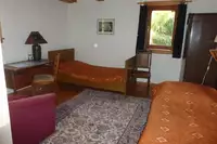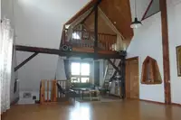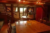 Im 2. Stock ist der Gruppenraum (ca. 50 m²) und 2 weitere Gästezimmer mit je 2 Betten untergebracht (1 Zimmer hat 2 normale Betten und ein Hochbett mit Matratze ). Über dem Gruppenraum befindet sich eine kleine Galerie mit verglaster Front, die sich durch Vorhänge abtrennen lässt. Dort steht Bett Nr. 13 (140 cm breit). Bettwäsche muss mitgebracht werden (oder gg. Leihgebühr) .