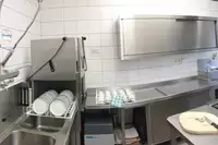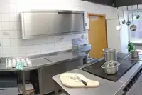 Großer Herd, Backofen mit Ober-/Unterhitze ( 2 Backbleche - Größen 500 x 640 mm und 370 x 580 mm), Mikrowelle, Wasserkocher, Kaffeemaschine, Pürierstab, gewerbliche Spülmaschine, großer Kühlschrank, großer Kühlschrank für Getränke sowie Kühlschrank in normaler Haushaltsgröße. Kochgeschirr, Geschirr, Besteck usw. vorhandenAusstattung Haus