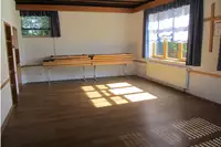 Tagesraum im Erdgeschoß mit Platz für 30 Personen. Völlig neu renovierte Einzel-WC und Duschen befinden sich im Untergeschoß. Gesellschaftsspiele, 20 Autoparkplätze