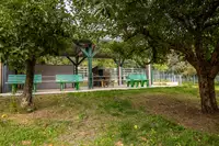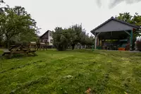Im Garten ist ein Spielzelt mit Outdoorkicker und Tischtennisplatte, so dass auch bei Regen nach Herzenslust gespielt werden kann.