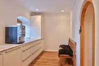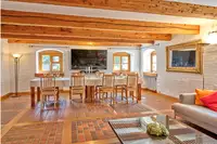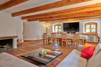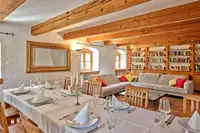 Im Erdgeschoss befindet sich ein ca. 50 m² großer Wohnraum mit Bibliothek, großem Esstisch und einer Wohlfühllandschaft. Das Kaminzimmer ist das Herz des Hauses, wo sich Jung und Alt zu einem fröhlichen Beisammensein treffen. An kalten Tagen wärmt ein prasselndes Feuer im Kamin. Ein 75“ TV mit einer Sonos SoundBar laden zu geselligen Abenden ein.