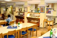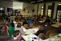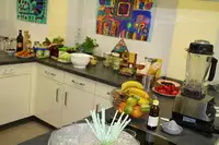 Mitmachküche für ca. 12 Personen. Küchenausstattung: Haushaltsherd, Kühlschrank, Backofen, Töpfe u. Geschirr/Besteck, Wasserkocher, Kaffeevollautomat