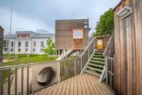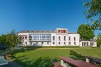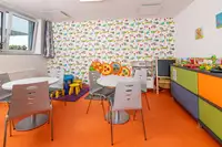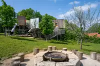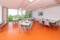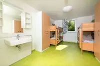 Neu dazu gekommen sind die Baumhäuser mit 2 x Zweibett- und 6 x Vierbettzimmer, alle mit Waschbecken. (Die Gemeinschaftsduschen und Toiletten sind im Hauptgebäude untergebracht). 4 Gemeinschaftsräume, 2 davon miteinander kombinierbar. Lehreraufenthaltsraum, Familienaufenthaltsraum, Freizeitraum mit Kicker.Im Außenbereich warten 2 Sonnenterrassen, ein Rasenplatz für Ballsport, 2 Grillstellen, Sandkasten, Rutschen und ein großes Freigelände mit Tischtennisplatten.