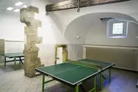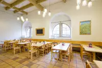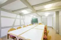 Zimmer für Betreuer mit Dusche/ WC, Speisesaal (130 Plätze), Gruppenraum (70 Plätze)Tischtennisplatten, Billard, Kicker, Flipchart, Beamer, Kopierer und Piano