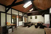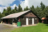 Blockhütte mit Aufenthaltsraum und Küche, Naturkühlschrank, Steinbackofen, Gasherd (Gas muss mitgebracht werden), sanitäre Einrichtungen: getrennte Toiletten und Waschräume mit Kaltwasser.Freizeit
