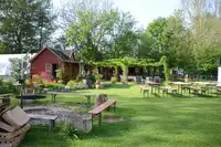 10x Schäferwägen (jeweils 1x Doppelbett u. 1x Einzelbett oben quer) und TinyHouse (1x Doppelbett), sanitäre Anlagen für alle am Gästehaus von außen begehbar