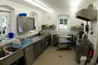Die Küche ist ausgestattet mit einem Großküchenherd, gewerblicher Geschirrspüler, Mikrowelle, Kaffee/Teeautomat, Aufschnittmaschine, 2 gewerbliche Kühlschränke, 1 Gefriertruhe