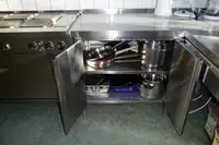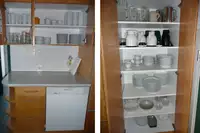 Spülmaschine, Kühlschrank, Wasserkocher, Geschirr, Töpfe, Pfannen, Kaffeemaschine.
