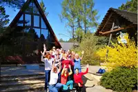 Wir haben 6 Gästehäuser (13 - 42 Betten) auf einem großen (ca. 24 ha) parkartigen Gelände; Wir vermieten die Gästehäuser komplett an eine Gruppe; deshalb können wir auch keine Einzelreisenden aufnehmen. 5 unserer 6 Gästehäuser werden nur inkl. Vollverpflegung vergeben.Eine Selbstverpflegungsmöglichkeit gibt es nur in einem der Gästehäuser (13 Plätze) sowie in vier daneben liegenden Holzhäuschen (á 4 Plätze); diese Häuser werden nur außerhalb der Frostperiode (d.h. von April bis Oktober) vermietet und müssen bei Bedarf selbst beheizt werden.
