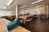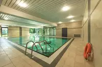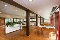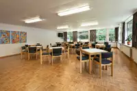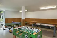 mehrere Gruppenräume mit TV, einen Werkraum, eine Bibliothek sowie eine Teeküche und das neu möbilierte Kaminzimmer, unsere “Spielbude” mit Kicker, Tischtennis und Airhockey sowie unseren “Kindergarten” für die Kleinsten, 70 qm großes Hallenbad .