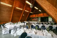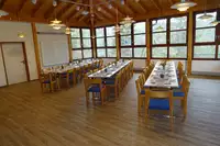 Das Gelände bietet wirklich viele Möglichkeiten! Die Grillstellen sind sehr einladend. Durch die Weitläufigkeit des Geländes hat man als große Gruppe 1. nicht das Gefühl, die anderen zu stören und 2. genug Raum für Aktivitäten im Außenbereich/ das Gefühl unter sich zu sein. Wir haben außerdem den Gemeinschaftsraum gemietet, welcher sich super als Frühstücksraum umfunktionieren ließ, genauso wie auch für Gruppenaktivitäten, Diashow, Kleingruppenarbeit etc. Daher fehlt der 5te Stern in meiner Bewertung aus rein subjektiven Gründen: Dadurch, dass unsere Hütten auf der anderen Geländeseite waren, mussten wir doch immer wieder hin und her gehen, was nun einfach der generelle Nachteil im Vergleich zu einer eigenen großen Hütte inkl. Gemeinschaftsräume ist. Auch haben wir einen gemütlichen Raum mit Sofaecke oder Ähnliches vermisst. Diese beiden Punkte hängen schlichtweg mit unserer Gewohnheit aus den Vorjahren zusammen. Denn das Gelände ist insbesondere bei gutem Wetter ja wirklich großartig nutzbar und auch für große Gruppen geeignet! Alles in allem hatten wir einen wirklich schönen Aufenthalt und haben uns rundum wohlgefühlt!