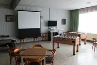 Sporthalle, TT-Raum, 4 Volleyballfelder, Waschmaschinenraum, Fotokopiergerät, Fernsehgerät+DVD, Stereoanlage, Ballspiele, Tischtennisplatte, 2 Sportplätze, 1 Beachballfeld, DFB-Minispielfeld, 80 AutoparkplätzeFreizeit