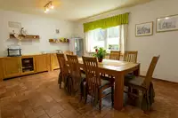 Unsere Pension ist auch ideal für Gruppenreisen bis maximal 18 Personen (z.B. auch für Motorradfahrer- oder Wandergruppen und Familienausflüge). Unser neues und modern ausgestattetes Ferienhaus erwartet Ihren Besuch. Wir verfügen über 7 Doppelbettzimmer . 4 der Doppelbettzimmer sind mit einer großen Schlafcouch ausgestattet, sodass hier noch weitere Gäste schlafen können. Zu den 7 Gästezimmern gehören 5 Bäder, alle mit Dusche und WC ausgestattet.Die Gästezimmer sind individuell und sehr geschmackvoll eingerichtet. Jedes Zimmer verfügt über Sat-TV-Flat-Geräte. Zum Ferienhaus gehört ein großer beheizter Wintergarten, der allen - bis zu 18 Personen - Platz bietet. Angrenzend an den Wintergarten gibt es den Frühstücksraum mit einer Frühstücksküche. Kühlschrank, Kaffeemaschine, Mikrowelle, Wasserkocher, Eierkocher, Toaster, Elektrobackofen und Geschirrspüler stehen hier zu Ihrer Verfügung. Eine weitere komplett ausgestattete Küche befindet sich eine Etage tiefer. Hier finden Sie nochmals eine komplett, mit allen Küchengeräten und Küchenutensilien ausgestattete Küche, zuzüglich Gewürzen, Töpfen und Geschirr in ausreichendem Maß.