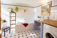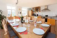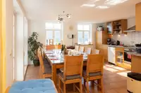 Eine tolle, gut ausgestattete Küche für bis 12 Personen mit riesigem Tisch, sowie einem Geschirrspüler. Im Bad EG ist eine Waschmaschine. Im Windfang können Sie Ihre Ski abstellen.