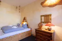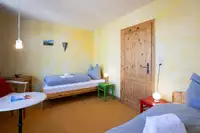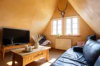 Eingetreten erwartet Sie der Flur von welchem man über eine Stufe in die top ausgestattete Wohnküche gelangt. Am gemütlichen Holztisch finden 12 Personen Platz. Im EG befinden sich 3 weitere mit Doppelbetten ausgestattete Schlafzimmer, sowie ein Wannenbad mit Waschmaschine und Wickeltisch. In der Zwischenetage erwartet Sie das urige Wohnzimmer, ausgestattet mit Internet-TV. Auf gleicher Ebene befindet sich ein weiteres Duschbad. In der oberen Etage erwarten Sie 2 gemütliche mit Doppelbett ausgestattete Zimmer, sowie ein Schlafraum mit zwei Einzelbetten (zusätzlicher TV).