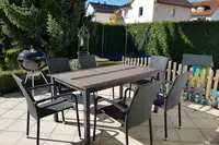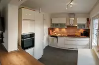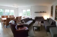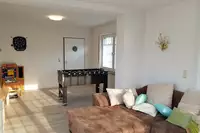 Weiterhin gibt es einen Wohn-/Essbereich mit Kabel-TV, eine moderne, voll ausgestattete Küche mit Spülmaschine, Backofen, Mikrowelle und Herd sowie eine Terrasse mit Grillmöglichkeit (erreichbar aus Küche, Wintergarten und Wohnzimmer). Auch steht ein großer Wintergarten mit Kickertisch und Dartscheibe zur Verfügung. Im Keller befindet sich eine Tischtennisplatte.
