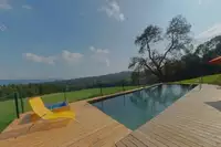 Im Außenbereich finden Sie Ihr stets (geöffnet von Frühsommer bis Spätherbst) bis auf 27 Grad beheiztes Schwimmbad in schöner Aussichtslage, zwei urige Holzhütten mit über 20 Sitzplätzen, natürlich mit einem großen Gartengrill und viele Spielgeräte für die Kinder.Im Nebengebäude können Sie zudem einen großen Gemeinschaftsraum, ebenfalls mit Heimkinosystem auf 3 - Meter Leinwand, einen Wellnessbereich mit Sauna, ein weiteres Spielzimmer für die ganz Kleinen und einen Tischtennis- und Kickerraum nutzen.