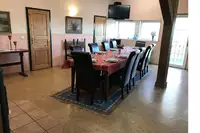 Die offene Küche ist komplett ausgestattet mit Spülmaschine, Herd, Backofen, Mikrowelle und einem großen Kühlschrank. Der angrenzende Esstisch bietet bequem Platz für alle Gäste. Der lichtdurchflutete Wohnbereich führt auf den Balkon. Grillen können Sie auf der großen Terrasse, die auch überdacht ist.