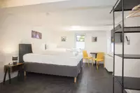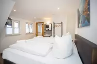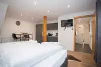 Im obersten Stockwerk befindet sich ein geräumiges Appartement mit kleinem Flur: Schlafbereich mit Doppelbett, Sitzecke mit Tisch und Barhockern und eine kompakte kleine Küche. Auf dieser Etage befinden sich ausserdem noch zwei weitere Schlafzimmer mit Doppelbetten .