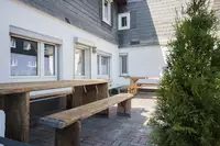 Auf der Terrasse können Sie bei schönem Wetter gemütlich an den Holzgartentischen speisen. Hier ist genug Platz für Ihre ganze Gesellschaft.