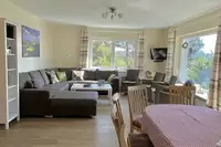 Im Erdgeschoss befinden sich ein geräumiger Eingangsbereich mit Garderobe, ein Schlafzimmer (DB), ein Bad, sowie ein großer Wohnbereich mit angrenzender sehr gut ausgestatteter Küche und großem Esstisch. Eine gemütliche Couchlandschaft und zahlreiche Sessel bieten reichlich Platz für alle Gäste. Es gibt Flachbild, DVD, CD, WLAN ( kostenlos)