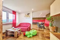 1 x abgeschlossene Zimmer für 7 Personen: Abgeschlossene Wohneinheit mit Doppelbett, mit Zugang zu weiteren 2 Doppelbettzimmern und Einzelbett, 1 x Dusche WC, 1 x separates WC, Balkon mit Panoramablick.